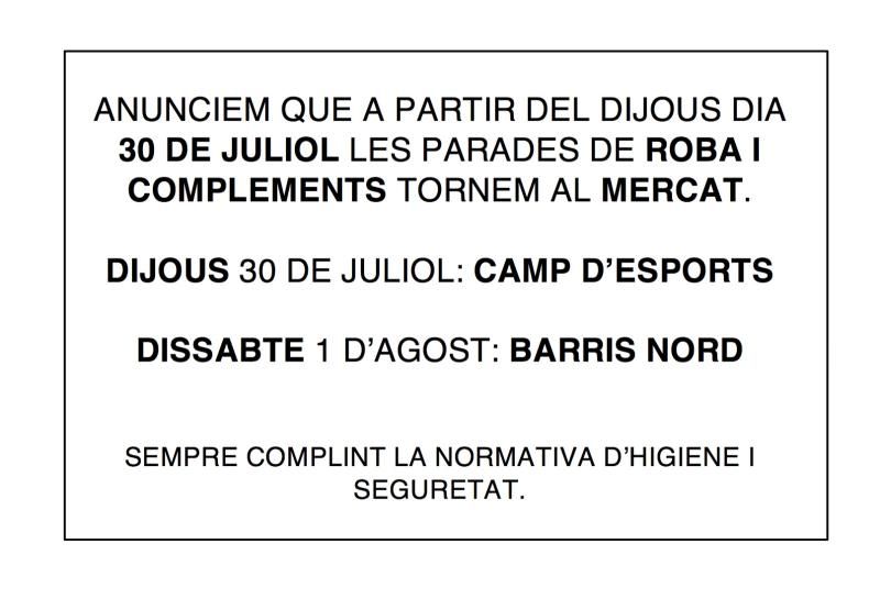Anunci retorn de les paradetes de roba i calçat als mercats de Lleida. CEDIDA.