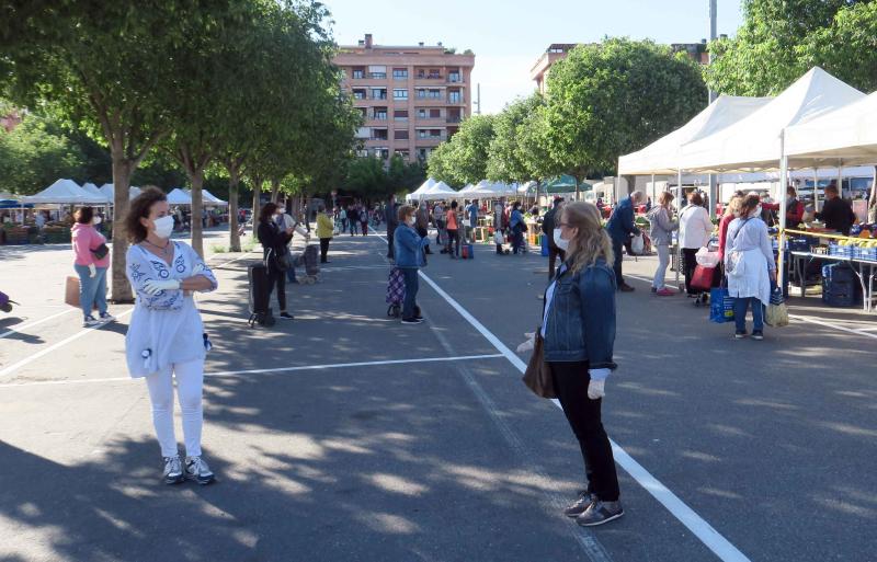 Voluntaris de Protecció Civil i tècnics de la regidoria, que han estat a cura del control dels accessos al mercat, delimitat únicament per dos punts, han vetllat també pel compliment d’aquestes normes, entre les quals hi havia la separació entre parades, una única cua per lloc de venda i la prohibició que els clients toquessin els productes.
