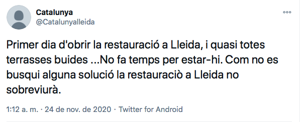 El primer dia de la desescalada deixa als hostalers de Lleida un sabor agredolç. Tot i que ahir els bars i restaurants ja van poder aixecar la persiana i muntar les seves terrasses, van ser poques les persones que es van atrevir a seure a l'exterior.