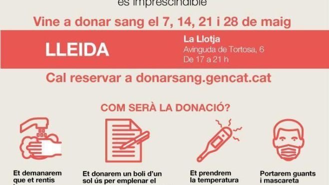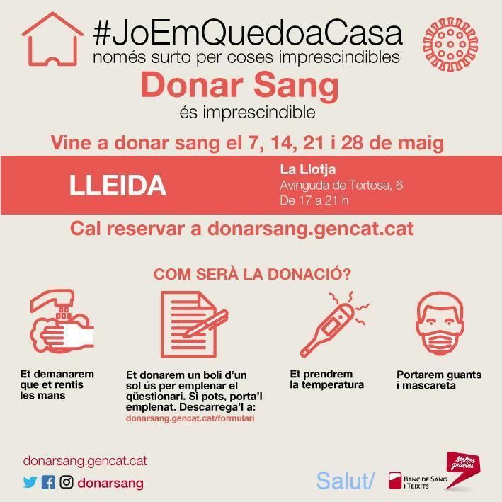 El Banc de Sang, que depèn del Departament de Salut de la Generalitat de Catalunya, se segueixen les mesures de prevenció i seguretat i les aplica al conjunt de les seves campanyes. Des d’aquesta setmana, entre d’altres accions, els donants disposen de gel esterilitzant en arribar a l’espai, han de guardar una distància mínima d’un metre amb la resta de persones i tenen un bolígraf d’un sol us per emplenar el qüestionari, entre d’altres.