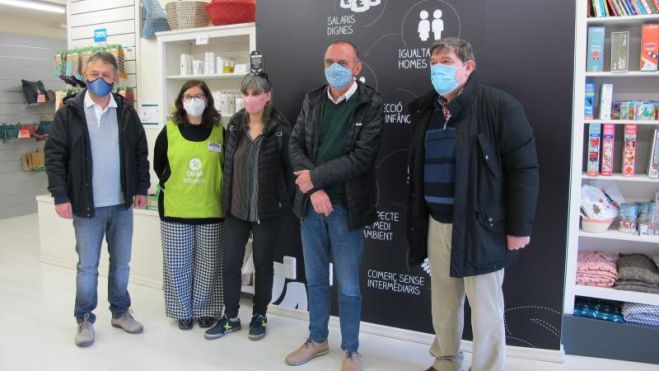L’alcalde de Lleida, Miquel Pueyo, juntament amb la tinent d’alcalde i regidora d’Educació, Cooperació, Drets Civils i Feminismes, Sandra Castro, ha visitat aquesta tarda la botiga de Comerç Just “Fil per randa”, que gestionen Càritas i Intermón-Oxfam.