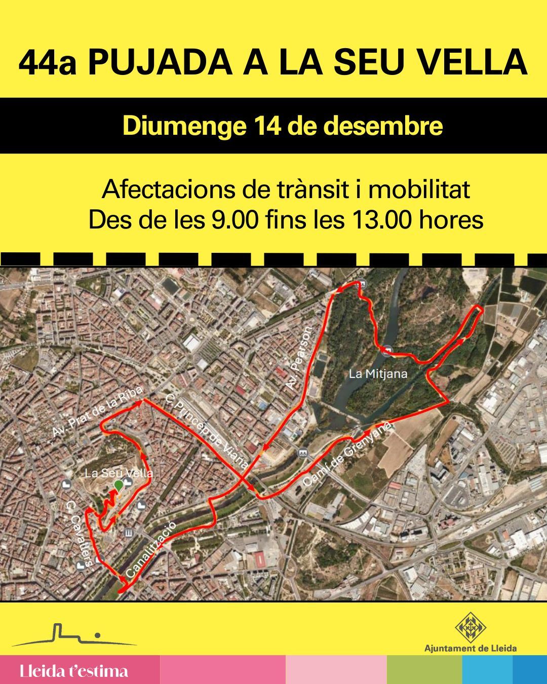 Lleida tornarà a reviure la tradicional Pujada a la Seu Vella de Lleida aquest diumenge amb la celebració d’una caminada i una cursa atlètica. La 44a edició, que tindrà lloc aquest diumenge, 14 de desembre, durant tot el matí, comportarà diversos talls i desviaments de trànsit pel centre de la ciutat.