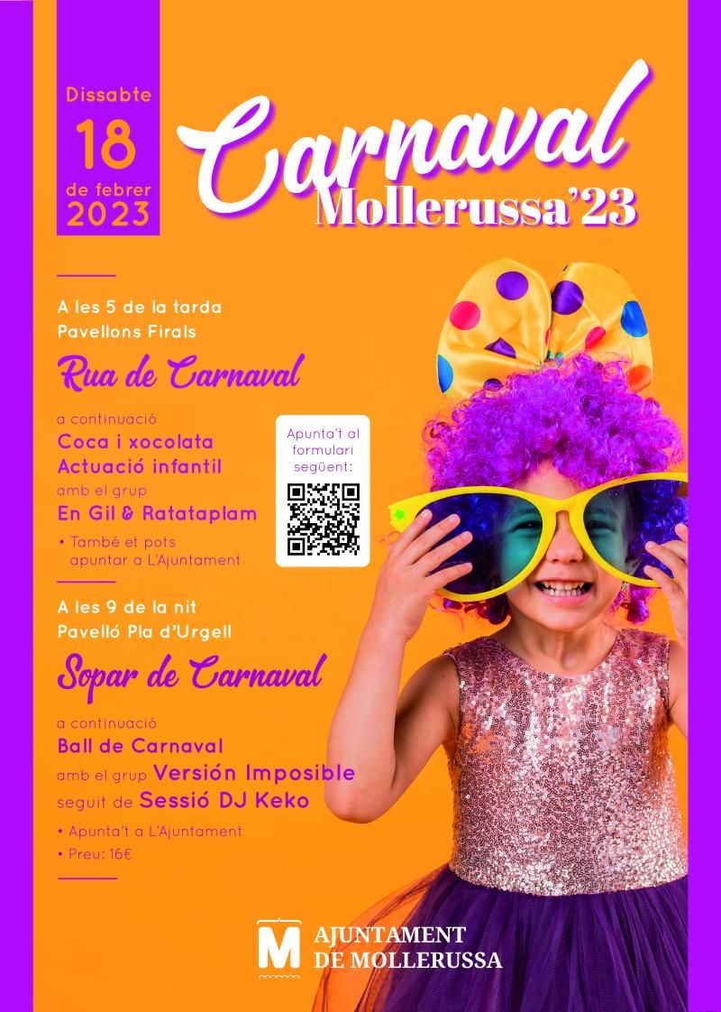 Mollerussa celebrarà el pròxim dia 18 de febrer la festa de Carnaval amb una rua pels carrers del centre i l’avinguda del Canal i recuperant el sopar popular a base de cassola de tros al Pavelló Pla d’Urgell, seguit d’una sessió de ball a càrrec del grup Versión Imposible i del DJ Keko.