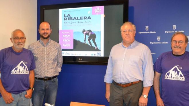 El diputat Jordi Verdú; el regidor de l’Ajuntament de Tírvia, Evarist Hidalgo; el coordinador de la cursa i vicepresident de l’Agrupació Excursionista ‘Catalunya’, Pep Molinos, i el responsable de logística de la prova, Jordi Secall, han participat en la roda de premsa de presentació de la novena edició de la cursa d’alta muntanya La Ribalera, que se celebrarà el dia 19 de juny a Tírvia (el Pallars Sobirà).