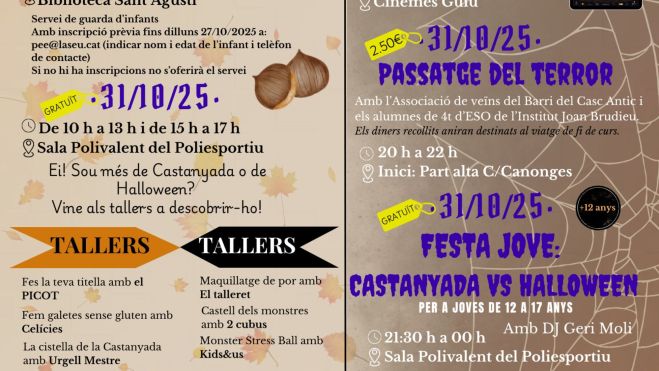 L’Àrea d’Infància i Joventut, i l’Àrea d’Educació, a través del Pla Educatiu d’Entorn, de l’Ajuntament de la Seu d’Urgell, han organitzat el programa de lleure i educatiu ‘Castanyada vs. Halloween’ amb més de mitja dotzena de propostes que s’adrecen tant al públic familiar com al públic juvenil, que tindran lloc del 29 d’octubre a l’1 de novembre.
