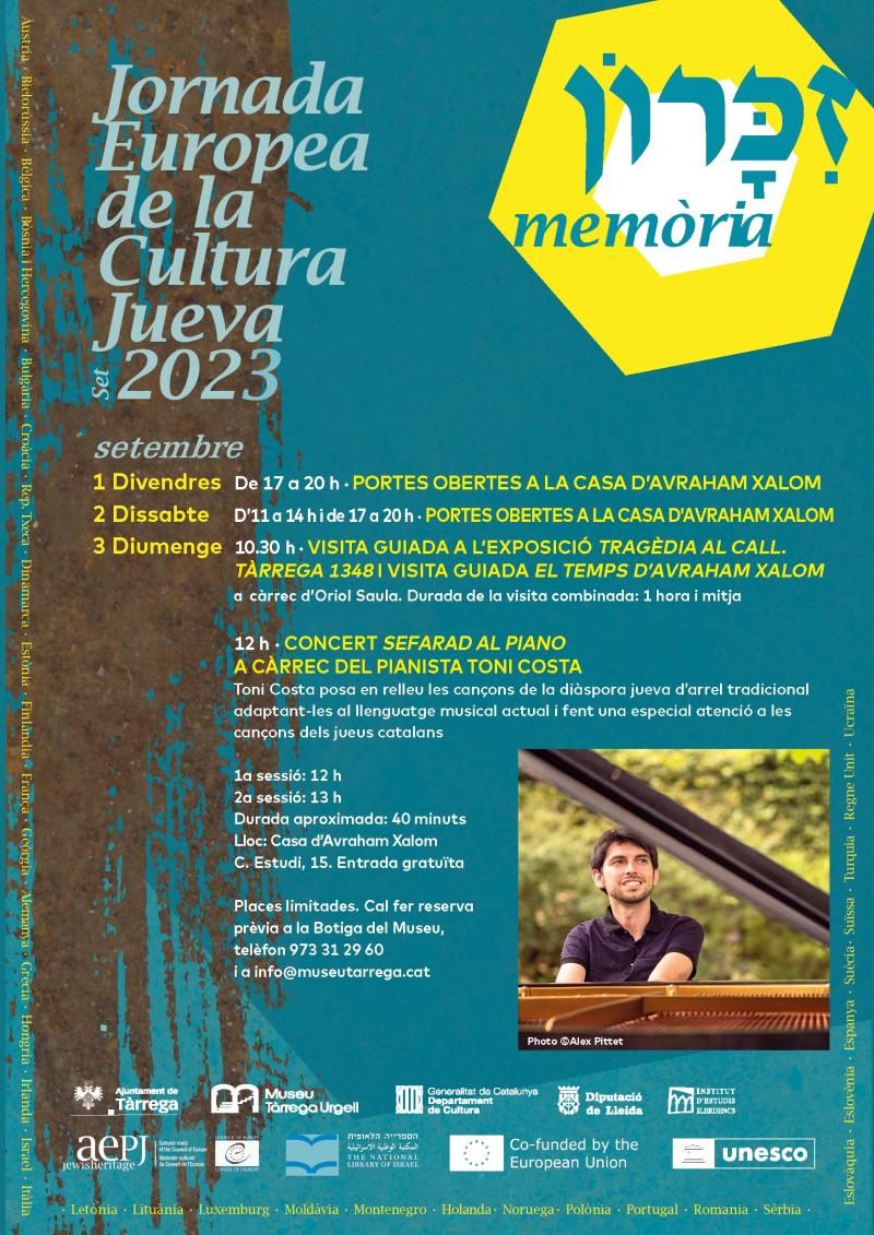 La Jornada Europea de la Cultura Jueva 2023 inclourà el diumenge 3 una altra proposta: el concert de Toni Costa titulat ‘Sefarad al piano’, del qual s’oferiran dos passis a les 12 i a la 1 del migdia a la Casa d’Avraham Xalom. Toni Costa és un reconegut pianista de música clàssica, antiga i d’arrel. A Tàrrega posarà de relleu un repertori de cançons jueves tradicionals amb arranjaments moderns. També sonaran composicions relacionades amb els “katalanim”, jueus catalans que van fundar dues comunitats a Roma i Salònica. Gratuït. Places limitades. Reserva prèvia a la Botiga del Museu (carrer Major, 11), telèfon 973 31 29 60 i a info@museutarrega.cat.