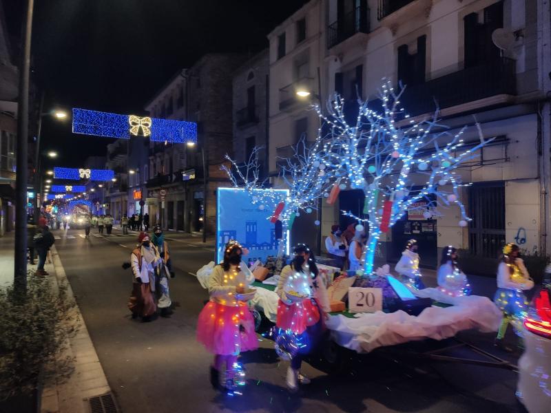 Dalt de les seves carrosses, ben abrigats i duent mascareta, Ses Majestats han anat saludant les persones assistents, secundats com és costum pel Patge Kassam. L'espectacular comitiva ha omplert altre cop de llum i color la ciutat. El seguici ha estat format per deu carrosses i bandes de música com BatBATuka, tambors de Diables BAT i la xaranga d'Amposta Aigua amb Gas juntament amb l'espectacle Els fabricants de caramels de La Pantomima de Lleida, protagonitzat per titelles gegants. L'Orquestra Mediterrània ha actuat a la carrossa de l'Estrella d'Orient i tampoc han faltat els Motards Tàrrega, muntures, furgonetes plenes de regals i un centenar de patges. La Verreta i Lo Tossino han recollit els xumets dels infants que ja se’n volien despendre.