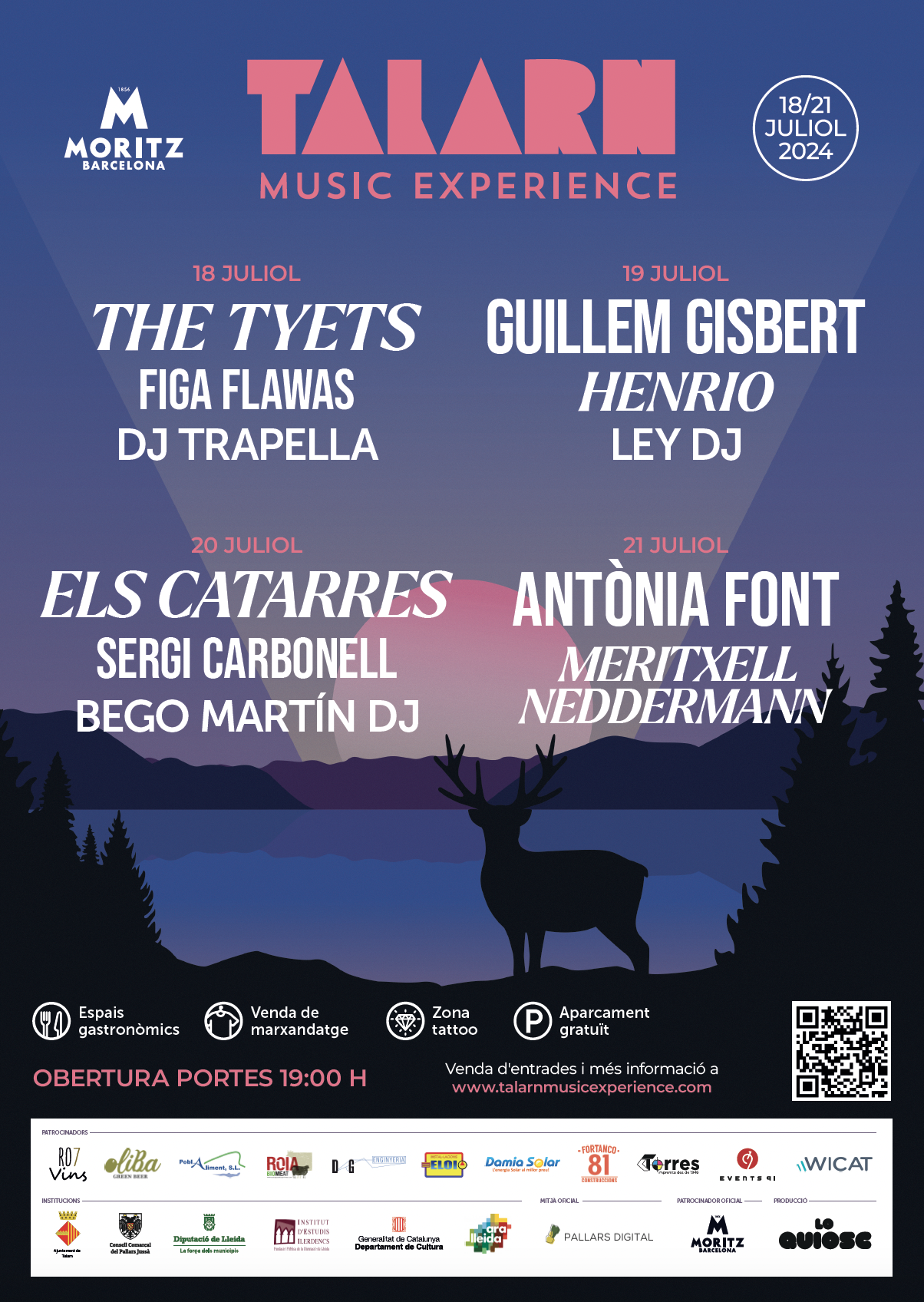 El festival musical del Pallars per excel·lència torna a l’estiu amb un cartell de primer nivell. Del 18 al 21 de juliol, a l'espai natural musical Lo Quiosc de Talarn, els grups del moment The Tyets, Figa Flawas, Guillem Gisbert, Antònia Font i els Catarres protagonitzen la millor edició del Talarn Music Experiencie, el festival que demostra que el Pallars també acull grans esdeveniments musicals.