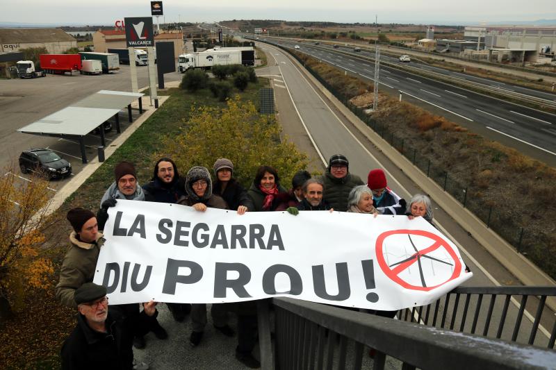 Una trentena de veïns de la Segarra han penjat aquest diumenge diverses pancartes a dos ponts que creuen l'A-2 al seu pas per Fonolleres, al municipi de Granyanella (Segarra), i la Panadella, a Montmaneu (Anoia), per mostrar el seu rebuig a la possible instal·lació de tres parcs eòlics a la comarca, als municipis de Talavera i Ribera d'Ondara. Les pancartes, amb els lemes 'La Segarra diu prou' i 'Renovables sí, però no totes aquí', volen denunciar aquests tres projectes que plantegen la instal·lació de 27 molins de vent, 9 per parc, així com de futurs que puguin afectar la comarca. Ferran Capell, membre de l'Associació Salvem la Ribera d'Ondara considera que aquests "macroprojectes" perjudiquen el paisatge i fan "poc atractiu" el territori.