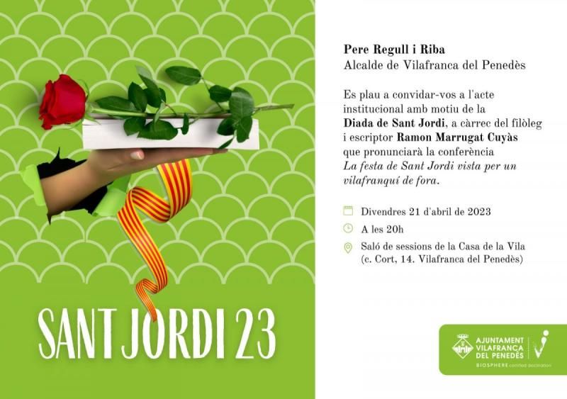 Com a acte previ, divendres 21 d’abril, a les 20h, tindrà lloc l’acte institucional commemoratiu de la Diada de Sant Jordi que organitza l’Ajuntament al saló de sessions de la Casa de la Vila. En aquesta ocasió el conferenciant serà Ramon Marrugat i Cuyàs, escriptor i filòleg, que parlarà sobre “La festa de Sant Jordi, vista per un vilafranquí de fora”. L’acte és obert a tothom.