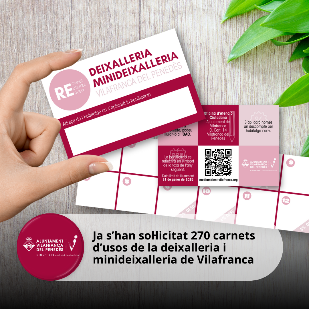 Per accedir a l’aplicació d’aquesta reducció en la taxa municipal, les persones residents a Vilafranca poden sol·licitar un carnet al personal que gestiona la deixalleria i la minideixalleria. Aquest carnet serà segellat cada vegada que en facin ús i la bonificació s’aplicarà en funció dels usos realitzats. En el primer mes i mig de funcionament de la campanya, s’han lliurat més de 270 carnets a la ciutadania.