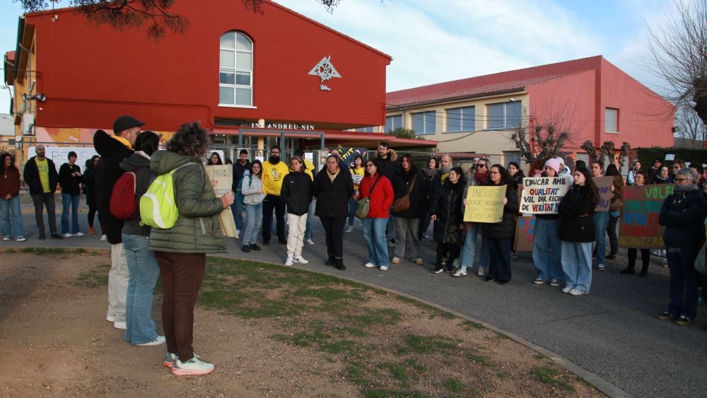 Un centenar de professionals s’han reunit davant de l’Institut Andreu Nin del Vendrell per llegir un manifest en què reclamaven reducció de les ràtios, menys burocràcia i millores salarials.