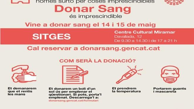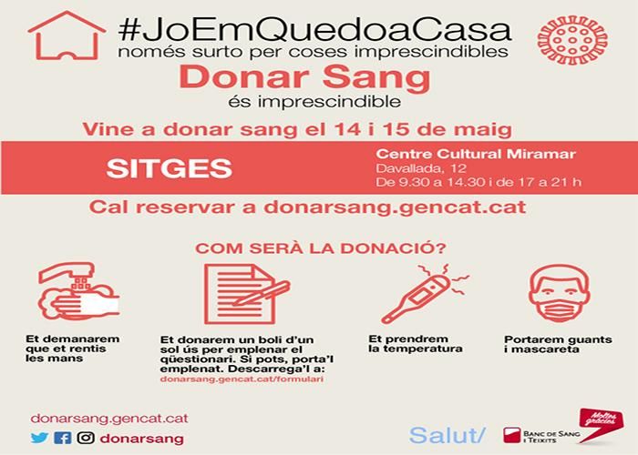 Sitges acollirà aquest dijous, 14 de maig, i divendres, 15 de maig,una campanya de donació de sang especial per garantir les donacions de sang a Catalunya durant aquests dies,en què cal fer front a la crisi del coronavirus. Aquesta iniciativa tindrà lloc de 09.30 a 14.30 h i de 17.00 a 21.00 hores al Centre Cultural Miramar, que disposarà de les mesures de prevenció i seguretat com a espai de donació de sang. Amb motiu de l’estat d’alarma, els donants han de reservar hora prèviament des de la pàgina web https://www.donarsang.gencat.cat/ca/. Aquesta mesura permetrà evitar aglomeracions.