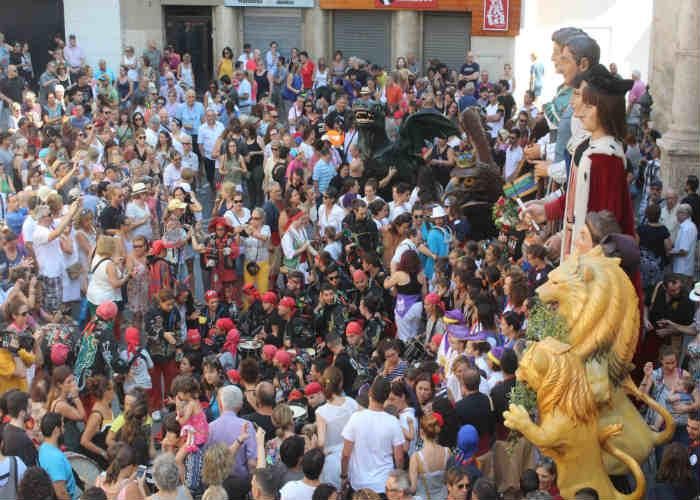 Imatge de la festa de benvinguda dels gegants del Vendrell a la Plaça Vella. Foto: Lluís TamayoA continuació, les batucades dels grups de foc assistents han tocat una peça conjunta davant del Salvador i la Teresa.