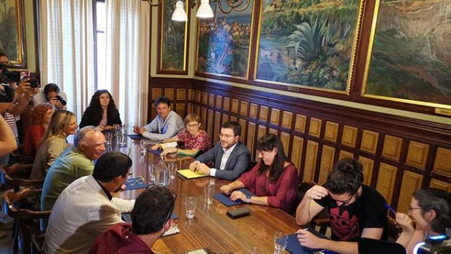 D'altra banda, mentre aquesta reunió es duia a terme al consistori vilanoví, a pocs metres tenia lloc una manifestació convocada per la Plataforma Aturem La Llei Aragonès amb la col·laboració de Capgirem Vilanova i la Geltrú-CUP, partit integrant del govern a la capital del Garraf conjuntament amb ERC i JxCat, on acusaven Aragonès de voler externalitzar i privatitzar àmbits de serveis públics en educació i sanitat.