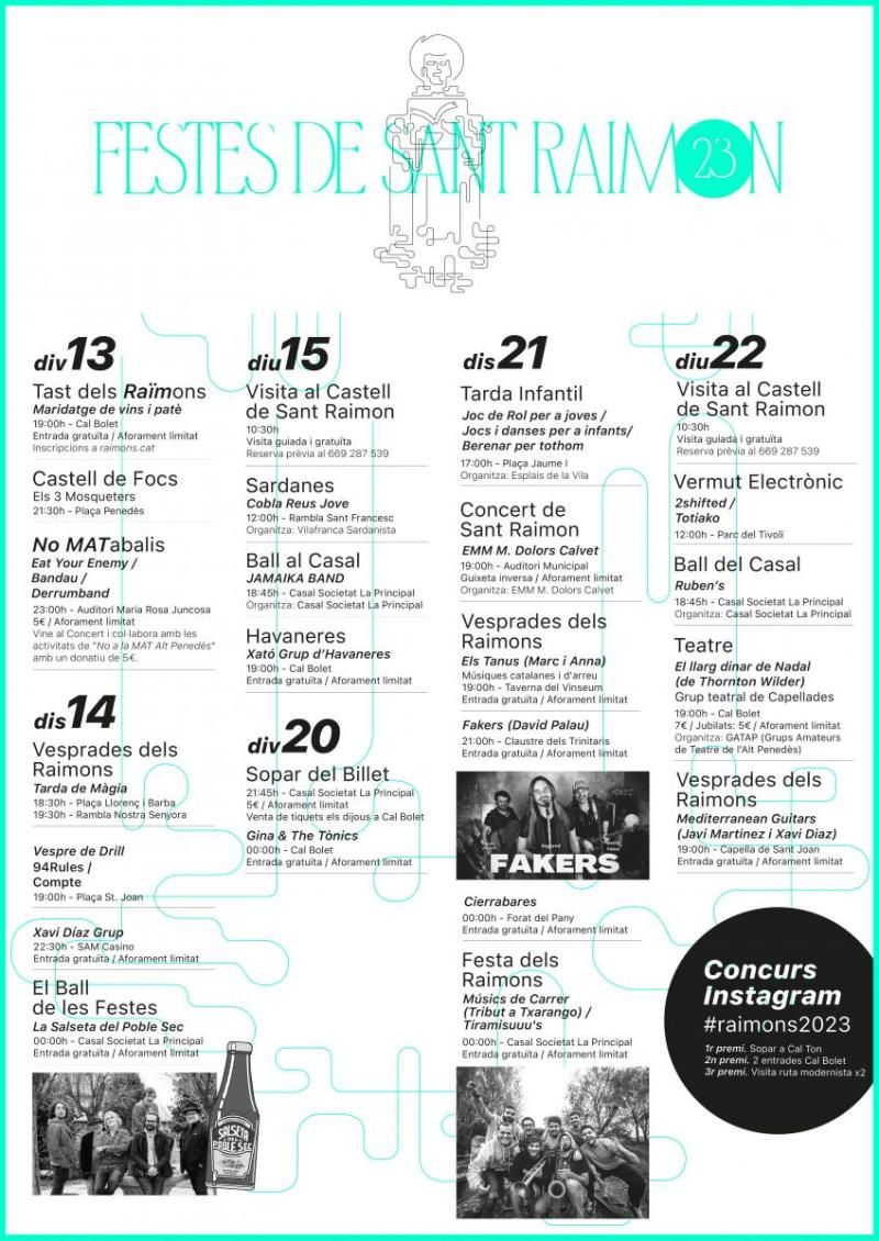 L’Agrupació de Raimons, entitat organitzadora de les festes, ha preparat una programa amb un total de vint-i-dos actes, set dels quals organitzats per altres entitats, i que conjuntament amb dues cercaviles, el Concurs d’Instagram i dues visites al Castell de Penyafort, casa natal de Sant Raimon, faran que aquest 2023 arrenqui amb força la vida cultural de Vilafranca.