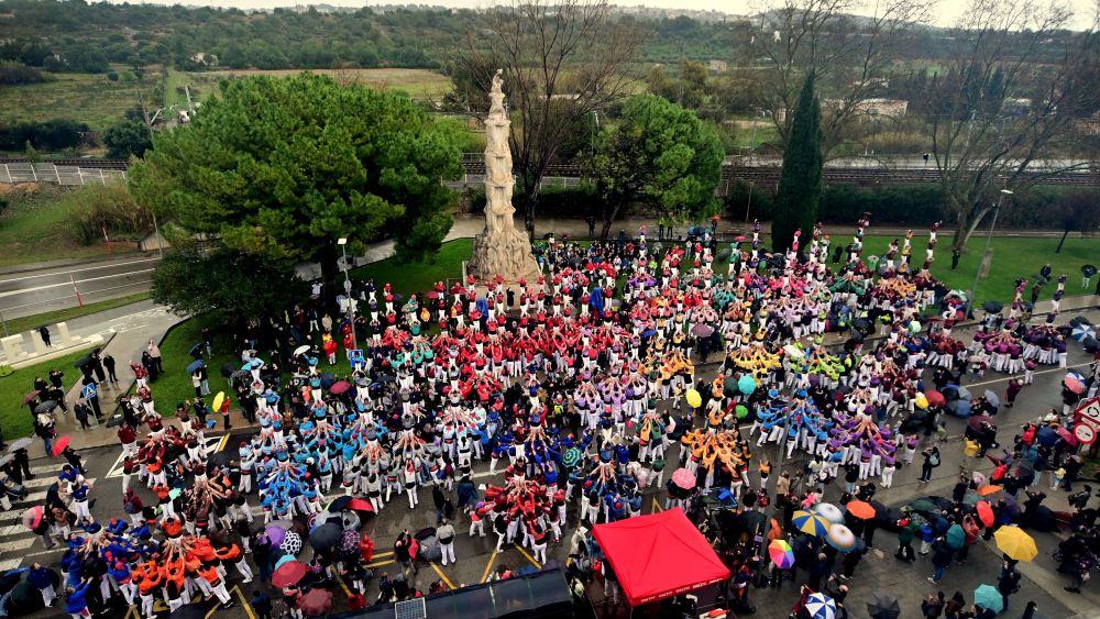 L’acte ha consistit en l’alçament simultani d’un centenar de pilars de quatre, situats al voltant del Monument als Castellers, obra escultòrica realitzada per Josep Cañas, que enguany celebra mig segle des de la seva inauguració. Aquesta imatge ha destacat per la seva espectacularitat visual i simbolisme, mostrant tant la coordinació com la cohesió entre les diferents agrupacions participants.