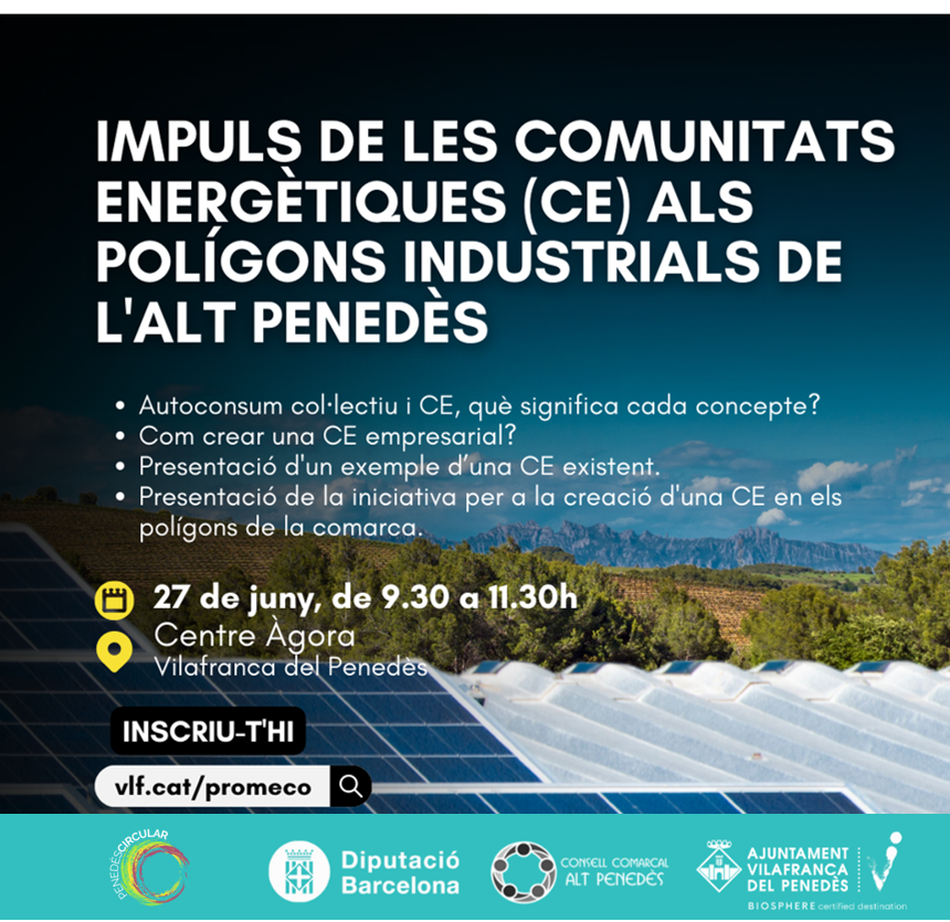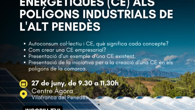 Penedès Circular, el programa supramunicipal que impulsen l’Ajuntament de Vilafranca del Penedès, la Mancomunitat Penedès Garraf i el Consell Comarcal de l’Alt Penedès, per ajudar a implementar l’economia circular al teixit productiu de la comarca, organitza una jornada amb el lema “Impuls de les comunitats energètiques als polígons industrials de l'Alt Penedès”. La jornada serà el dimarts 27 de juny, de 9.30 a 11.30 h, al Centre Àgora de Vilafranca del Penedès.
