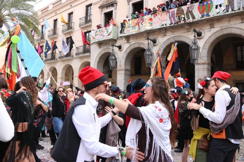 Les Comparses han tornat aquest diumenge a Vilanova i la Geltrú després de 2 anys, ja que l'any passat l'acte més emblemàtic del carnaval del municipi no es va poder fer per la pandèmia. Tot i que enguany s'ha fet sense públic a la plaça de la Vila, el retorn de la celebració s'ha viscut amb "moltes ganes de festa i emoció". "Avui és un dia gros pels vilanovins perquè la plaça torna a ser nostra", ha celebrat la regidora de Cultura del consistori, Mercè Mateo, tot afegint que avui s'enceta "la nova normalitat". Com és tradició, els comparsers han lluït clavells, mantó de Manila i barretina per saltar i fer guerres de caramels. Enguany, però, s'ha reduït de 9.000 a 6.000 el nombre de parelles que hi ha partici-pat per evitar aglomeracions.