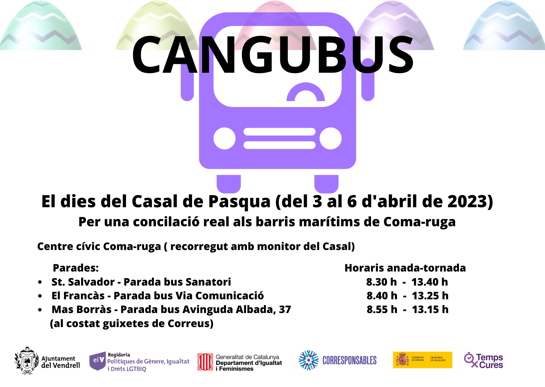 A més a més, per al casal de Coma-ruga s’ha inclòs un servei de transport “El Cangubus”, que permetrà anar des de diferents parades dels barris marítims fins al Centre cívic de Coma-ruga, on es fa el Casal de Pasqua. Aquest servei permetrà una conciliació igualitària donada la dispersió geogràfica del nostre municipi.