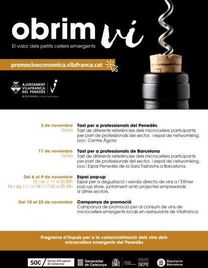 Vilafranca del Penedès ha donat el tret de sortida al programa “Obrim Vi”, una iniciativa pionera impulsada per l’Ajuntament, a través del Servei de Promoció Econòmica i amb el suport de la Diputació de Barcelona, que té com a objectiu impulsar la visibilitat i la comercialització dels vins dels microcellers joves del territori.