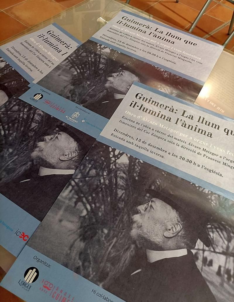 L’Orgue del Vendrell s’ha volgut sumar també a la commemoració de l’Any Guimerà. Per fer-ho, ha encarregat al músic Álvaro Metzger una composició lliure que tingués l’orgue com a protagonista. Aquest ha composat “Guimerà: La Llum que il·lumina d’ànima”, una obra per a orgue i veus femenines, que s’estrenarà el proper divendres 13 de desembre, a les 20.30 h, a l’Església del Vendrell.