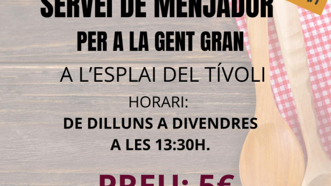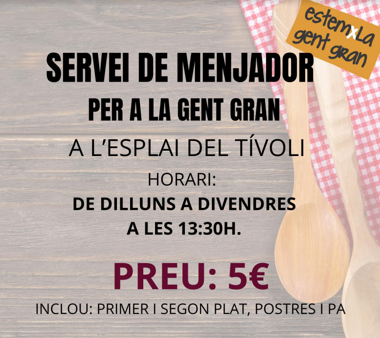 El servei el realitza l’empresa Serunion, de dilluns a divendres, a les 13:30 h. El preu de l’àpat té un cost de 5 euros i consta de primer, segon plat, pa i postres. I s’ha de fer una inscripció prèvia als telèfons 628449179 i 652243616.