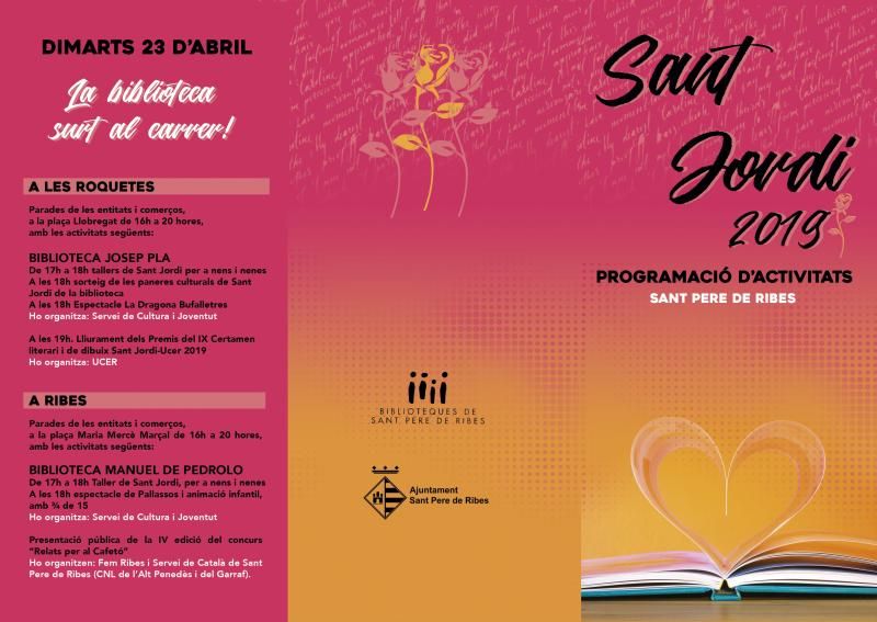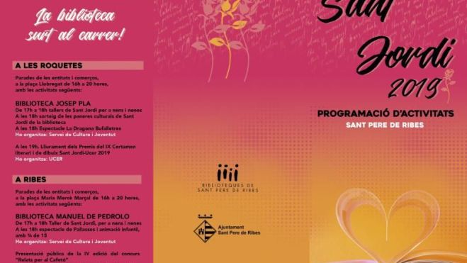 La diada de Sant Jordi tornarà a omplir Sant Pere de Ribes de tot tipus d’activitats culturals durant el mes d’abril. Diferents entitats del municipi, juntament amb les biblioteques municipals, han preparat una gran quantitat d’actes per a tot tipus de públic.