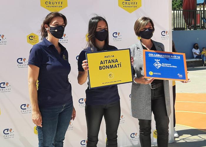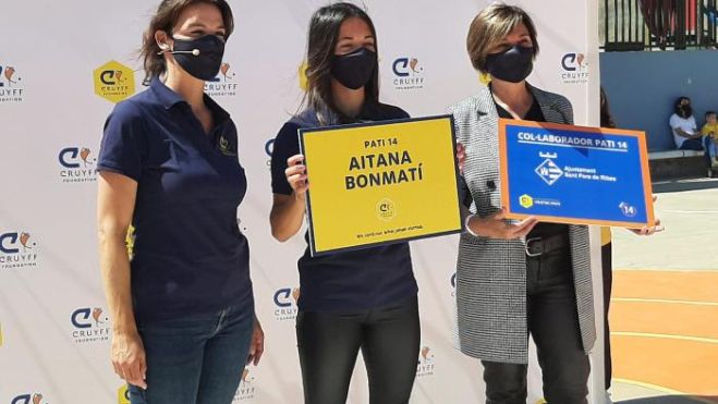 La jugadora Aitana Bonmatí ha participat en la inauguració de les instal·lacions del projecte Pati 14 de la Fundació Cruyff, a l’Escola El Pi, on havia estudiat, abans de la recepció institucional. Bonmatí ha apadrinat aquestes instal·lacions com a ambaixadora de la Fundació Cruyff. El Pati 14 és una iniciativa dirigida a l’alumnat de les escoles de Primària que té com a principal objectiu motivar els i les alumnes perquè juguin junts i juntes, facin exercici i practiquin diferents esports.