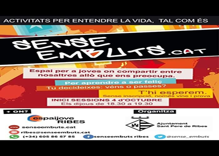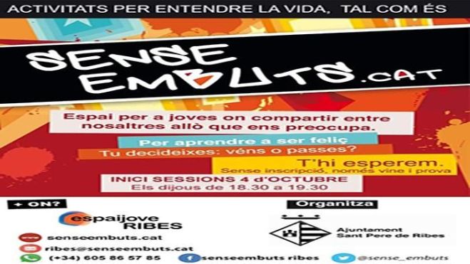 L’espai Jove de Ribes organitza un any més unes xerrades per a joves anomenades SENSE EMBUTS que tindran lloc a les seves instal·lacions (c. de Salvador Dalí, 61) els dijous, de 18.30 a 19.30h, a partir del proper 3 d’octubre i fins al 28 de novembre.