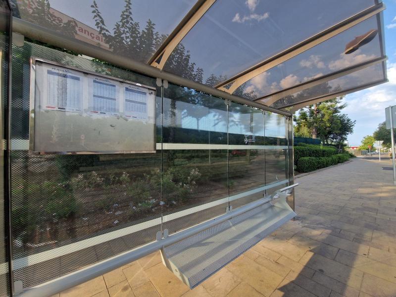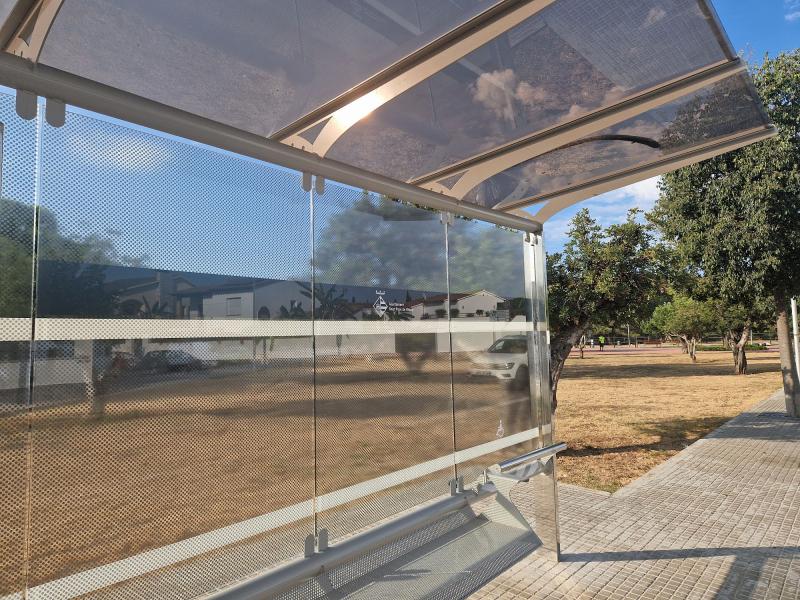 Així, les noves marquesines, que a més estan ubicades a prop d’un entorn natural, incorporen aquests vinils impresos en tota la seva superfície amb una trama de punts i unes franges horitzontals per tal que les superfícies transparents es facin visibles per a les aus i evitin les seves col·lisions.