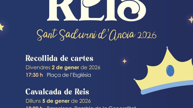 La Cavalcada de Reis se celebrarà dilluns 5 de gener a les 18 h, amb un recorregut que passarà pels carrers Barcelona, Rambla Generalitat, Raval, Dr. Escayola, plaça de l’Ajuntament i Marc Mir, fins a arribar a la plaça de l’Església.