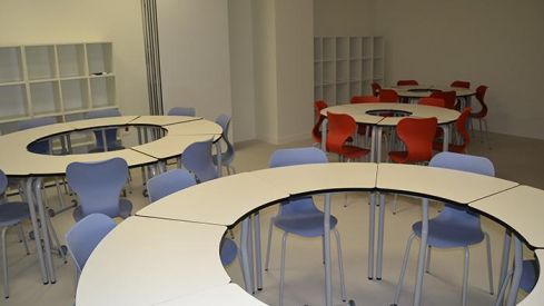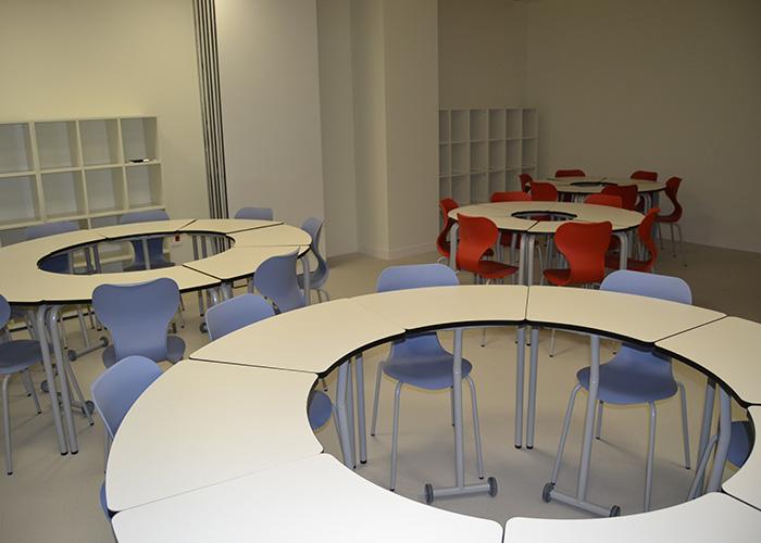 L'edifici comptaamb tres plantes i 10 aules que estan adaptades al nou model pedagògic. A la planta baixa hi ha la recepció, el garatge, sis aules individuals, de les quals tres es converteixen en una aula polivalent amb capacitat per a 75 persones.  En aquest espai també hi ha una terrassa.