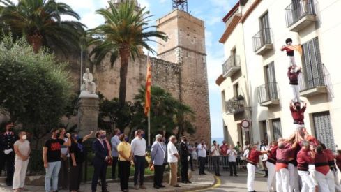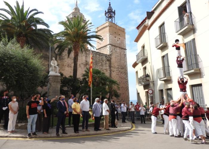 La celebració ha finalitzat amb un pilar de la Colla Jove de Castellers de Sitges, format mentre sonava ‘Els Segadors’, també a càrrec de l’Escola de Grallers.