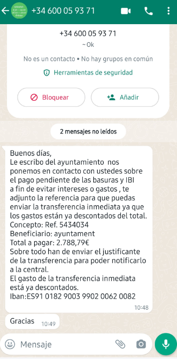 Diverses empreses han advertit la Policia Local d'una estafa en què es rep una trucada suplantant la identitat de l'Ajuntament de Sant Sadurní en què s'informa que hi ha hagut un problema en el cobrament de tributs (Escombraries i IBI), seguida d'un whatsapp en què es proporciona un número de compte per fer l'ingrés del suposat deute.