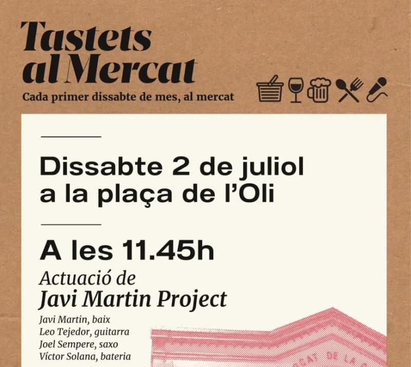 Els Tastets al Mercat, l’aposta cultural i gastronòmica que té lloc cada primer dissabte de mes a la plaça de l’Oli, aportarà encara més jazz al cap de setmana, amb l’actuació de Javi Martín Project, el dissabte 2 de juliol.