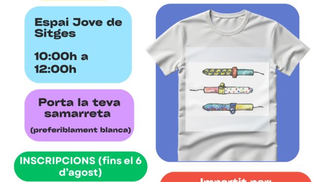 La samarreta de Festa Major és un peça de vestuari especial que s’ha convertit amb el pas dels anys en un element emblemàtic. Cada any n’hi ha de molt originals i per poder dissenyar-ne una, l’Espai Jove de Sitges organitza el taller ”Personalitza la teva samarreta de Festa Major”. La iniciativa s’adreça a nois i noies a partir de 12 anys i té un cost de 8 euros.