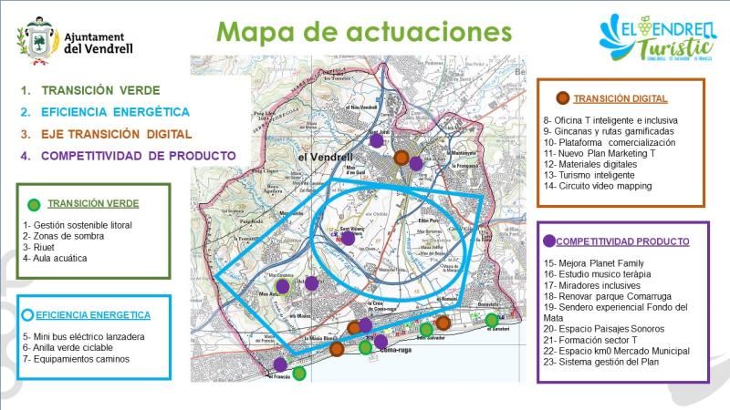 El pla que s’ha presentat a la convocatòria planteja un conjunt d’accions en diferents punts del municipi a través de quatre eixos: transició verda, eficiència energètica, transició digital i competitivitat.