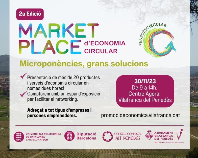 El dijous 30 de novembre, durant tot el matí, se celebrarà a la seu del servei de Promoció Econòmica, al Centre Àgora de Vilafranca, el segon Marketplace del Penedès Circular. Es tracta d’una jornada de treball i intercanvi de propostes i solucions per ser aplicades a les empreses que desitgin incrementar la circularitat dels seus processos productius. Està impulsada pel Servei de Promoció Econòmica de l’Ajuntament de Vilafranca, el Servei de Desenvolupament econòmic i Ocupació del Consell Comarcal de l'Alt Penedès i la Universitat Politècnica de Catalunya (UPC).