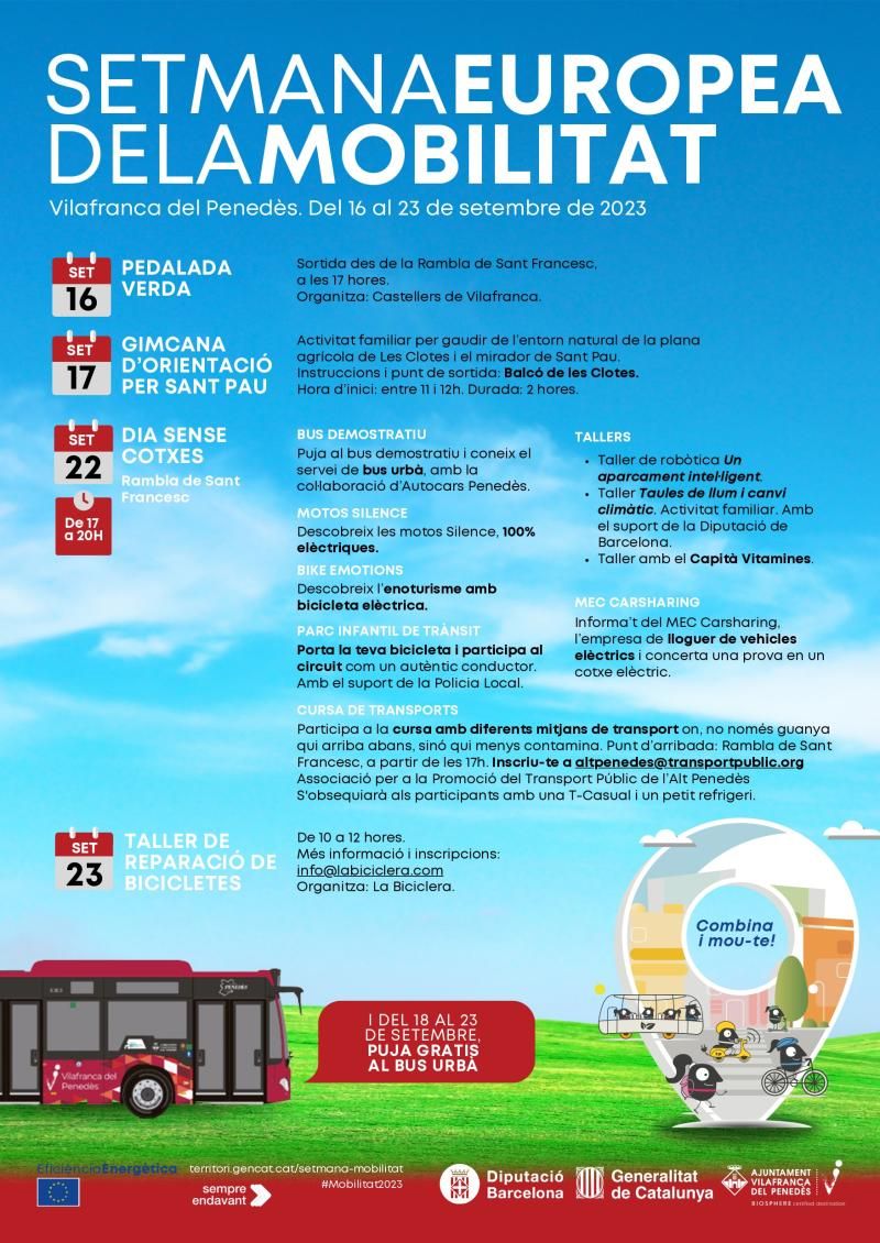 Del 16 al 23 de setembre se celebra la Setmana Europea de la Mobilitat 2023 sota el lema Combina i mou-te. Coincidint amb aquesta commemoració, l’Ajuntament de Vilafranca del Penedès impulsa un cartell d’activitats adreçades a promoure la mobilitat sostenible i durant tota la setmana del 18 al 23 de setembre, el bus urbà serà d’accés gratuït.