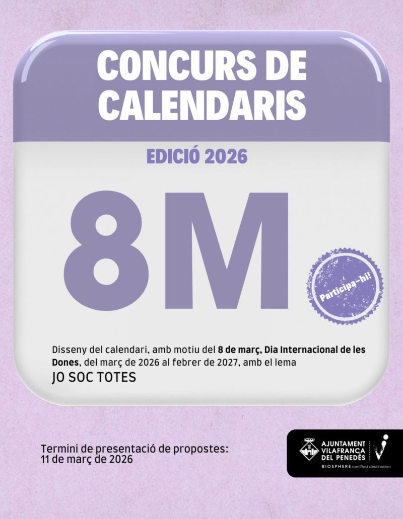 El Servei d’Igualtat de l’Ajuntament de Vilafranca ha anunciat l’obertura d’una nova convocatòria per al concurs destinat a dissenyar el calendari commemoratiu del 8M-Dia Internacional de les Dones, corresponent al període comprès entre el març de 2026 i febrer de 2027. Aquest any, el certamen manté com a eix temàtic el lema “Jo soc totes”, que busca posar en valor la solidaritat, la lluita conjunta i la cooperació entre dones per promoure l’equitat en drets i responsabilitats dins la societat.