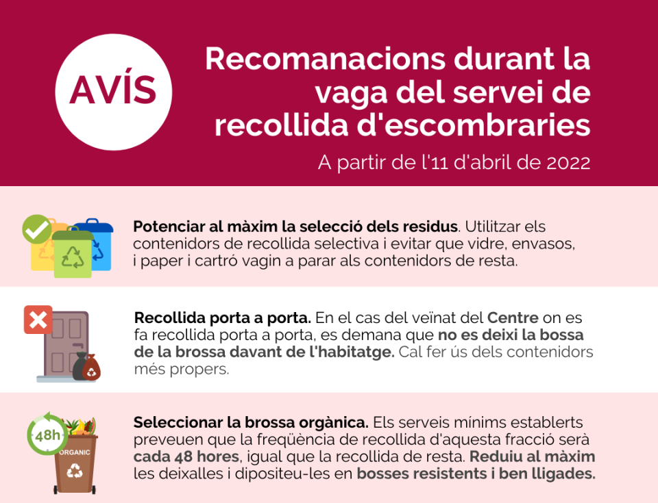 - Seleccionar la brossa orgànica. Els serveis mínims establerts preveuen que la freqüència de recollida d'aquesta fracció serà cada 48 hores, igual que la recollida de resta. En la mesura del que sigui possible, es demana reduir al màxim les escombraries i guardar-les a casa fins al dia de la recollida. Dipositeu-les en bosses resistents i ben lligades.
