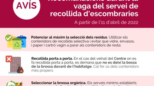 - Recollida porta a porta. En el cas del veïnat del Centre on es fa recollida porta a porta, es demana que no es deixi la bossa de la brossa davant de l'habitatge. Cal fer ús dels contenidors més propers.