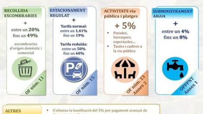 També s’apuja entre un 4 i un 8% el rebut de l’aigua, en contra del criteri de la resta de l’àrea metropolitana que l’ha baixat gairebé un 5%, com també es proposen increments de les taxes d’ocupació de la via pública, afectant especialment al gremi de restauració, que veuran com d’una banda es redueixen els espais i d’altra banda, s’apugen les taxes.