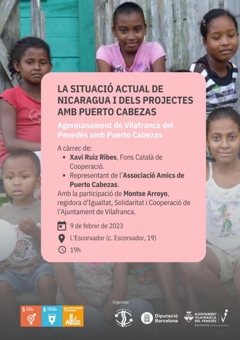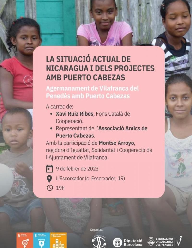 El servei de Solidaritat i Cooperació de l’Ajuntament de Vilafranca i el Fons Català de Cooperació al Desenvolupament, amb la col·laboració de l’Associació d’Amics de Puerto Cabezas, presentaran en un acte obert a tothom l’estat d’execució dels projectes en els quals l’Ajuntament de Vilafranca col·labora i donar a conèixer l’actual context social i polític de Puerto Cabezas/Bilwi i de Nicaragua.
