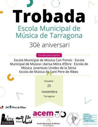 Demà dissabte 25 de novembre, Tarragona acollirà la celebració dels 30 anys de l’Associació Catalana d’Escoles de Música (ACEM). Nombroses escoles de música d'arreu de Catalunya es reuniran, a partir de les 16.30 h, a l'auditori de la Diputació de Tarragona per oferir un concert en el qual participaran un total de 108 alumnes d'agrupacions de corda, coral, piano, grups de guitarres.
