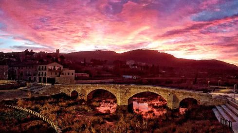És una imatge del Pont Vell, a primer terme, el baluard, la Serra i els plans de Sant Joan, al fons, amb un espectacular cel rogent que es reflecteix en l’aigua del riu Francolí. Fou publicada per Joan Pau Jàvega (@joanpau.jv) el 15 de gener i l’endemà mateix era compartida per Montblanc Medieval.