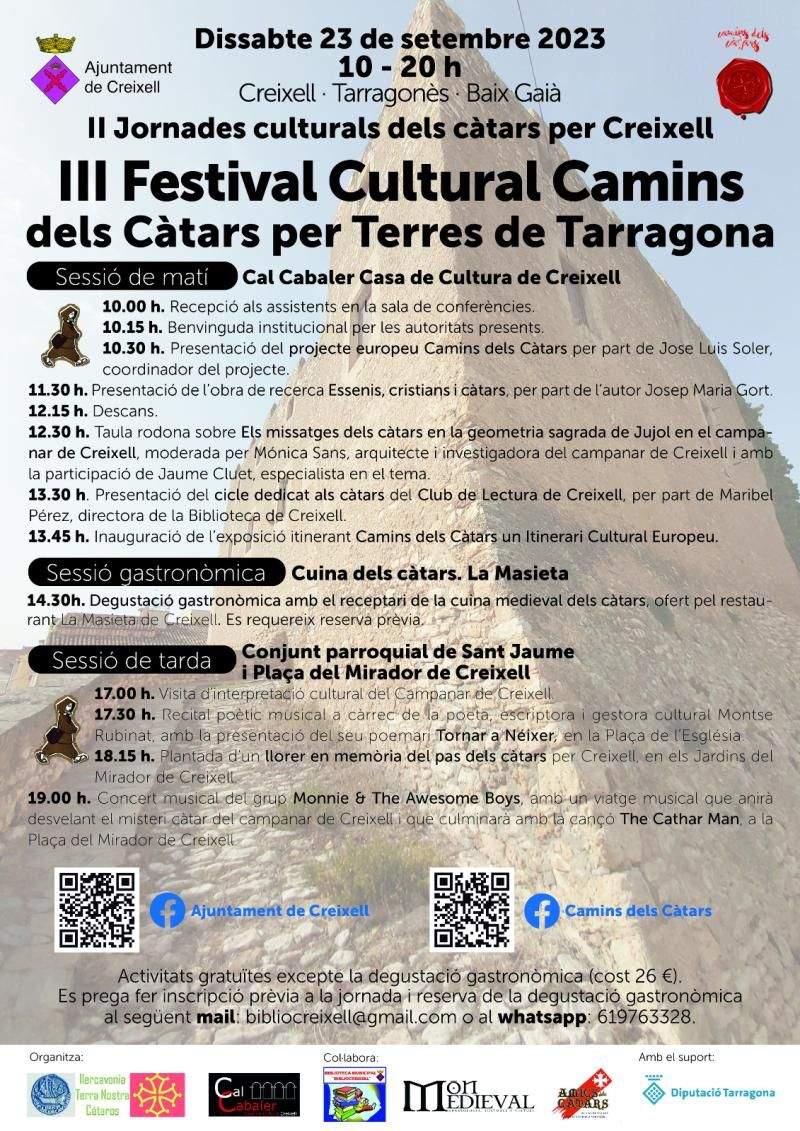 El dissabte 23 de setembre de 2023 de 10 h a 20 h a diferents espais de Creixell —Cal Cabaler, La Masieta, Parròquia de Sant Jaume i plaça del Mirador— tindrà lloc una Jornada cultural singular per conèixer una de les històries més desconegudes i sorprenents rere les petjades dels càtars i el campanar de Jujol a Creixell.El dissabte, 23 de setembre, a partir de les 10 h, tindrà lloc a Cal Cabaler. Casa de Cultura Creixell la segona edició de les Jornades culturals dels Càtars per Creixell.