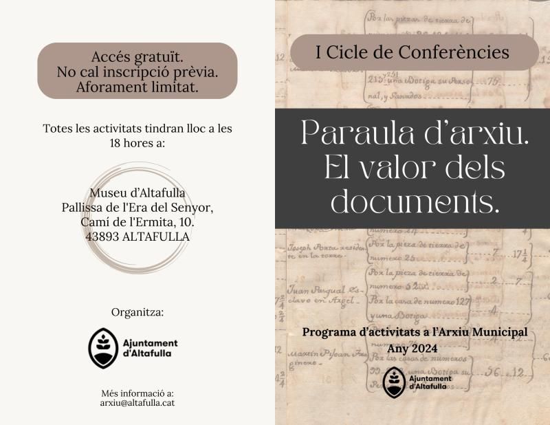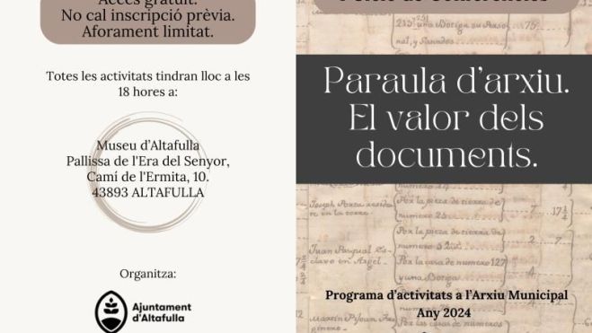 La regidoria de Cultura de l’Ajuntament d’Altafulla, que encapçala l’edil Gemma Maymó, i l’Arxiu municipal organitzen el primer Cicle de Conferències a l’Arxiu: “Paraula d’arxiu. El valor dels documents”. Es tracta de la primera acció de difusió que es comença a fer des de la inauguració de l’Arxiu el passat 17 de novembre de 2023, i té com a objectiu explorar el paper dels arxius com a mitjà de coneixement.