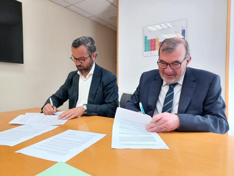 Federic Adan, president de l’Associació Contra el Càncer a Tarragona, i Joan Maria Adserà, director general de la Xarxa Santa Tecla Sanitària, Social i Docent han signat la renovació i ampliació del seu conveni marc de col·laboració.